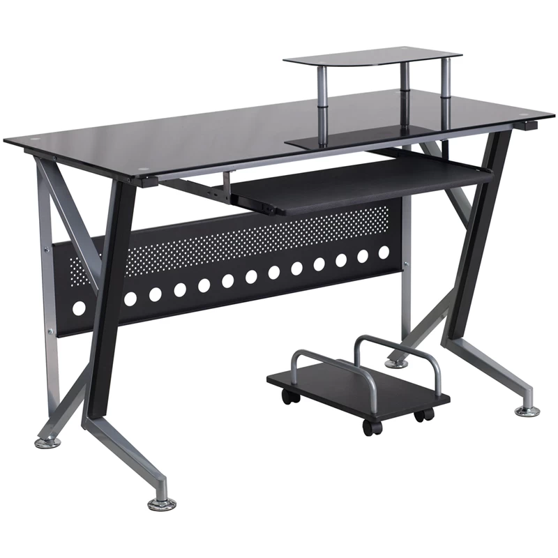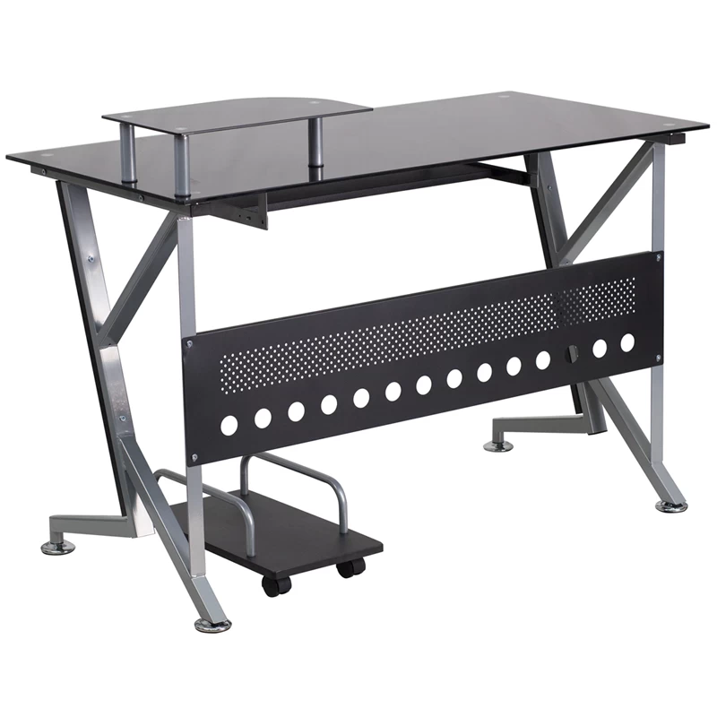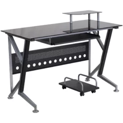 This computer station offers a modern touch with black glass surfaces. Investing in a desk for your home makes working from home or managing household bills and paperwork a nicer experience. The raised monitor shelf gives you more work space for your paperwork and writing utensils. The pull-out keyboard platform can store your keyboard away when no longer needed for a clean appearance. This desk also features a privacy panel and a convenient CPU cart so you can place it where it suits your needs.
