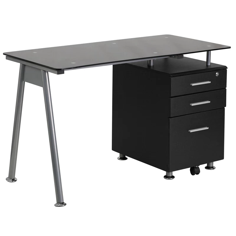 This Black Computer Desk combines glass and black wood for a contemporary look.The desk features a beveled desktop made from black tempered glass and an accenting silver powder coated frame. A black, three drawer pedestal with handsome silver bar pulls keeps your paperwork organized while you’re working and secure when you’re away. The top drawer locks with a key. The bottom file drawer has a built-in caster that provides additional support and makes it easy to open and close the drawer, even when it’s full. Self-leveling floor glides keep the desk from wobbling on uneven floor surfaces and protect your floor by sliding easily when you want to move the desk.The Black Computer Desk with Glass Top and Three Drawer Pedestal is an efficient and secure workstation that works well in small spaces.