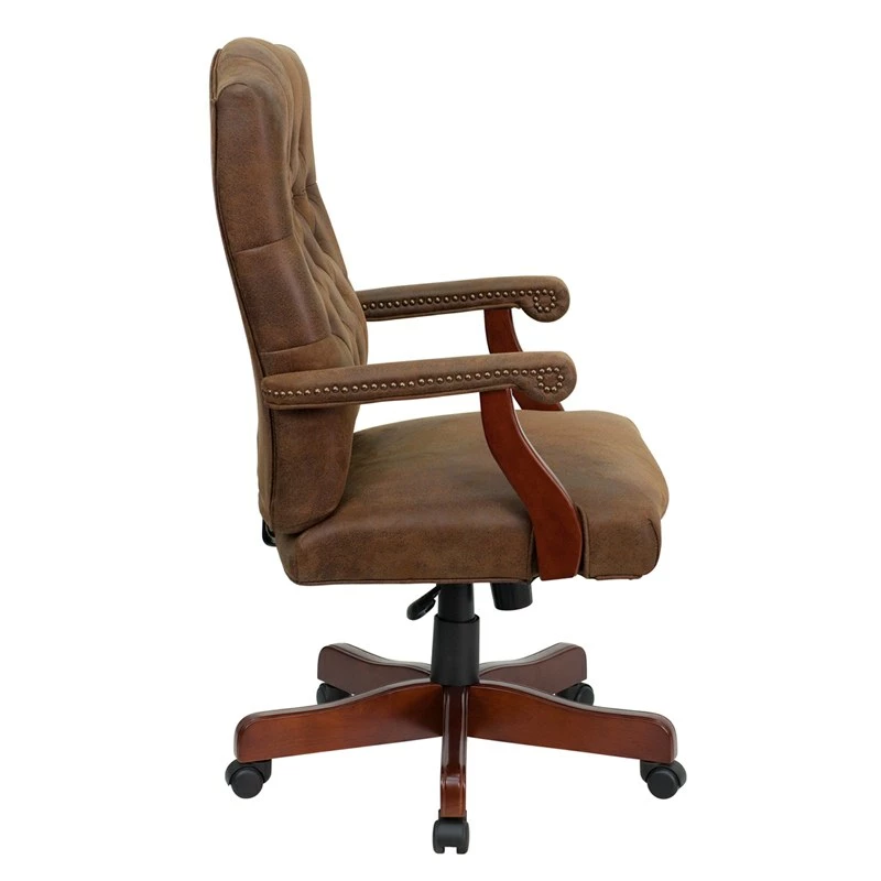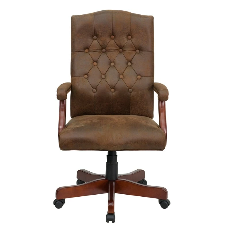 This luxurious traditional chair is available in Brown Suede upholstery. Chair easily swivels 360 degrees to get the maximum use of your workspace without strain. The pneumatic adjustment lever will allow you to easily adjust the seat to your desired height. The arms are adorned in classic brass nail trimming. Ergonomically designed for a healthy way to work this chair will provide you with ample comfort, in the office or at home.
