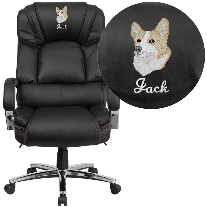 This office chair features plenty of thick, plush padding for comfort along with an embellished mesh trim throughout the chair. Finding a comfortable chair is essential when sitting for long periods at a time. Big & Tall office chairs are designed to accommodate larger and taller body types. This chair has been tested to hold a capacity of up to 500 lbs., offering a broader seat and back width. High back office chairs have backs extending to the upper back for greater support. The high back design relieves tension in the lower back, preventing long term strain. The included headrest will take the pressure off of your neck while leaning back. The tilt lock mechanism offers a comfortable rocking/reclining motion. The free rein motion is great for taking a quick break from typing to answer phone calls and relax. The waterfall front seat edge removes pressure from the lower legs and improves circulation. Chair easily swivels 360 degrees to get the maximum use of your workspace without strain. The pneumatic adjustment lever will allow you to easily adjust the seat to your desired height. The chrome base adds a stylish look to compliment a contemporary office space. Personalize it with a name, logo or company name embroidered on the chair’s headrest. Select a design from our Digital Library (20,000 Images) or submit your own custom design. Choose from many available fonts and thread colors.
