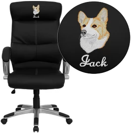 This stylishly designed office chair features leather upholstery with white stitch accents to comfortably get you through your work day. High back office chairs have backs extending to the upper back for greater support. The high back design relieves tension in the lower back, preventing long term strain. The generously padded headrest will take the pressure off of your neck while leaning back. Chair easily swivels 360 degrees to get the maximum use of your workspace without strain. The pneumatic adjustment lever will allow you to easily adjust the seat to your desired height. The silver nylon base with black caps prevents feet from slipping when resting on chairs base. Personalize this chair with custom text or a logo to show off your individual style or company design.