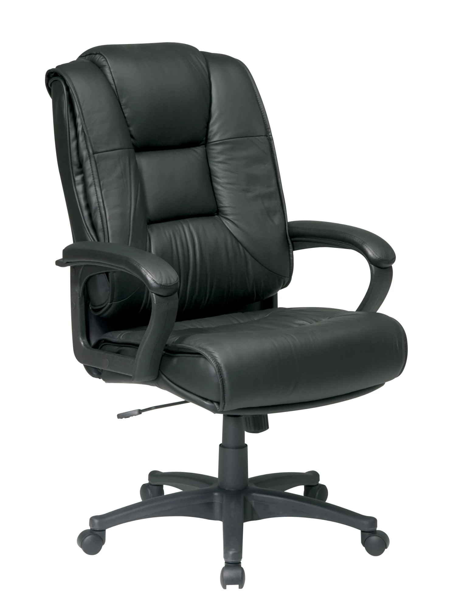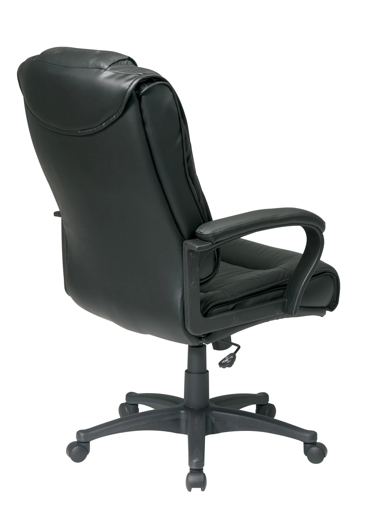 Deluxe High Back Executive Black Glove Soft Leather Chair with Padded Loop Arms. Thick Padded Contour Seat and Back with Built-in Lumbar Support. One Touch Pneumatic Seat Height Adjustment. Locking Tilt Control with Adjustable Tilt Tension. Padded Loop Arms. Glove Soft Leather: (G-13) Black, Top Grain Leather. Heavy Duty Nylon Base with Dual Wheel Carpet Casters.