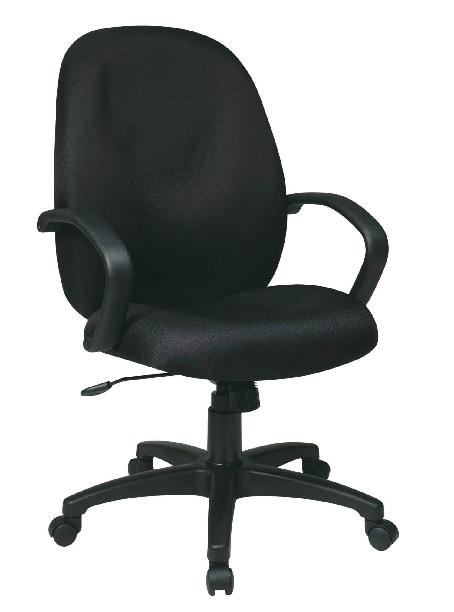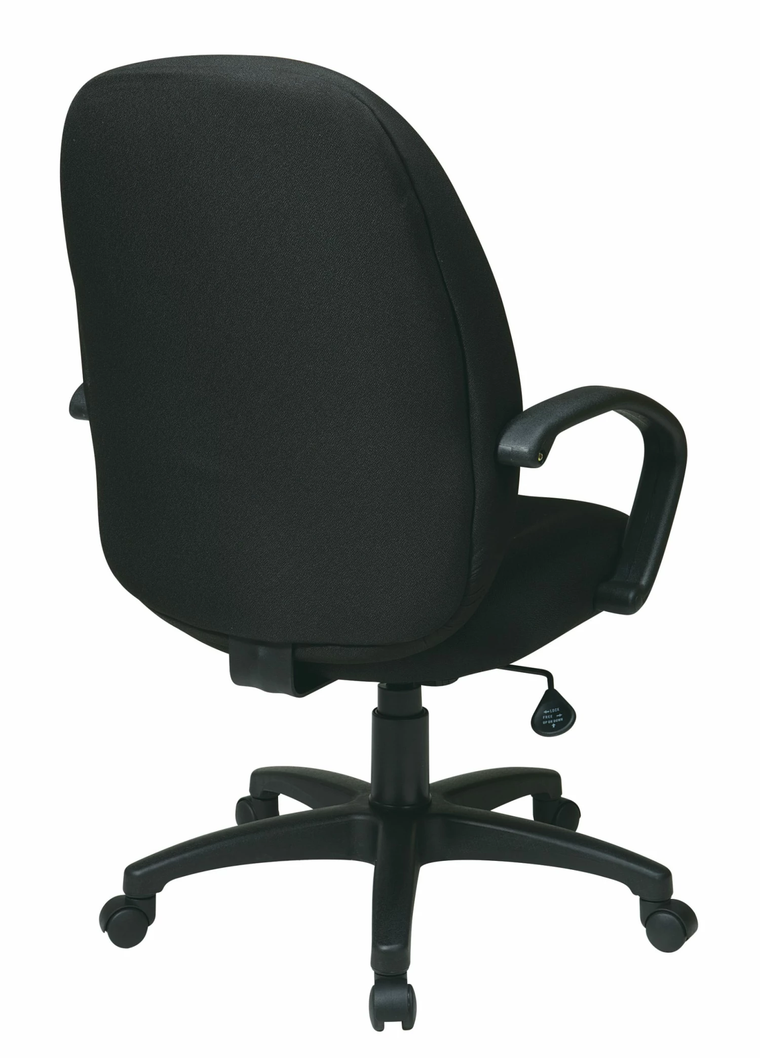 Executive High Back Managers Chair with Fabric Back. Thick Padded Contour Seat and Back with Built-in Lumbar Support. One Touch Pneumatic Seat Height Adjustment. Locking Tilt Control with Adjustable Tilt Tension. Nylon “C” Arms. Heavy Duty Nylon Base with Dual Wheel Carpet Casters.