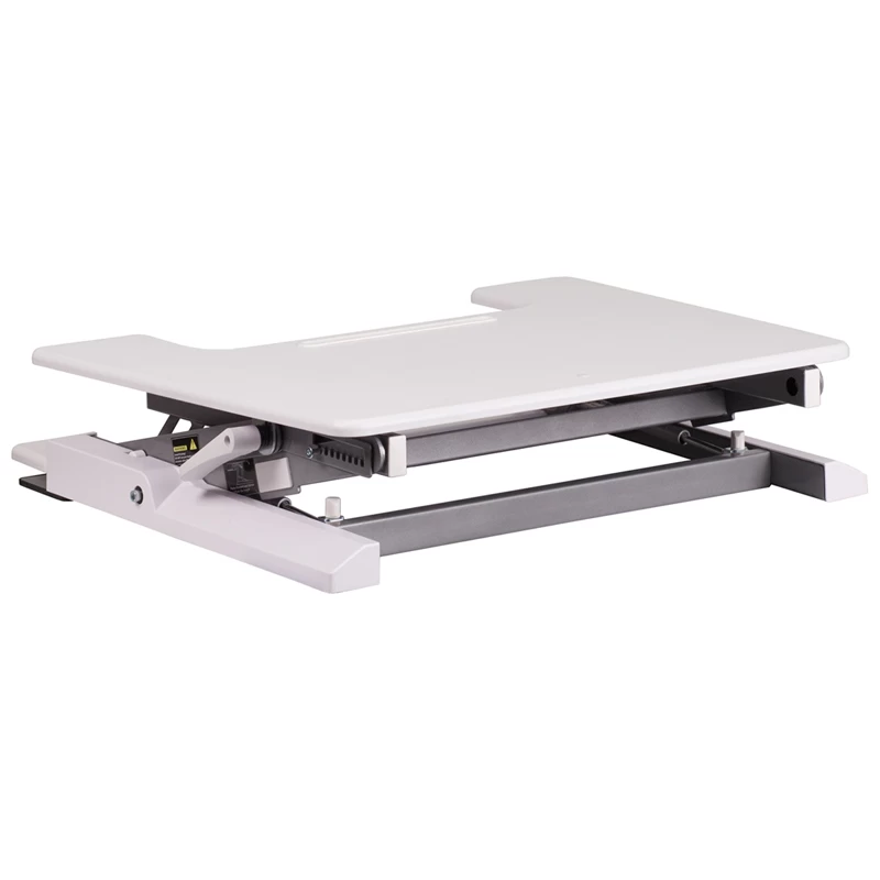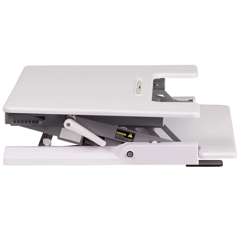 Achieve a healthier way of working with a Sit and Stand Monitor Desktop Platform. We all know that sitting for hours is an unhealthy practice, but with long workdays it has become more common. Standing helps strengthen leg muscles, improves your balance and promotes healthy blood flow. Standing even burns more calories than sitting. This desk gives you the option to sit down or stand up. The dual levers raise and decline the tables height to achieve your desired position. The grooved teeth on the sides aid in keeping the top in place. The top features a convenient writing utensil tray. The ergonomic keyboard tray keeps a staggered height between the keyboard and monitor without having to manually adjust. Nonskid rubber pads protect the desk’s surface and prevent the unit from sliding.