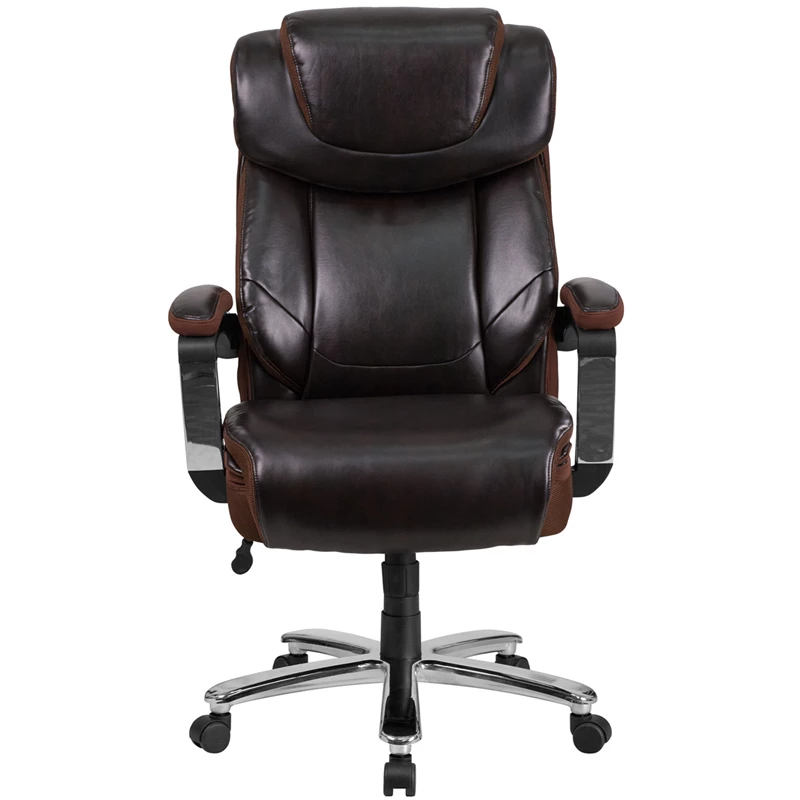 This office chair features plenty of thick, plush padding for comfort along with an embellished mesh trim throughout the chair. Finding a comfortable chair is essential when sitting for long periods at a time. Big & Tall office chairs are designed to accommodate larger and taller body types. This chair has been tested to hold a capacity of up to 500 lbs., offering a broader seat and back width. High back office chairs have backs extending to the upper back for greater support. The high back design relieves tension in the lower back, preventing long term strain. The included headrest will take the pressure off of your neck while leaning back. The tilt lock mechanism offers a comfortable rocking/reclining motion. The free rein motion is great for taking a quick break from typing to answer phone calls and relax. The waterfall front seat edge removes pressure from the lower legs and improves circulation. Chair easily swivels 360 degrees to get the maximum use of your workspace without strain. The pneumatic adjustment lever will allow you to easily adjust the seat to your desired height. The chrome base adds a stylish look to compliment a contemporary office space.