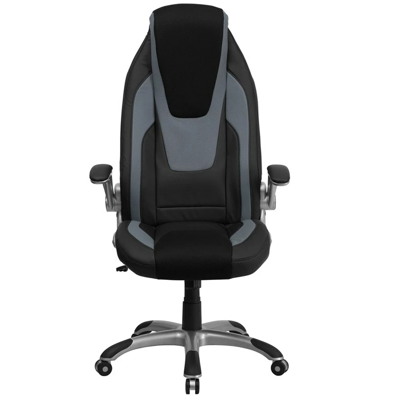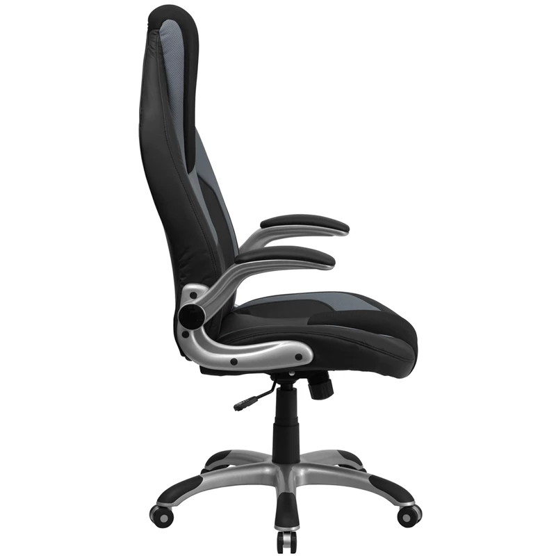 If you’re looking for a comfortable chair than you’ve found it in this contemporary office chair that features an ergonomically designed seat and back. This chair is designed with black vinyl upholstery, highlighted with gray vinyl and black mesh insets in the headrest and seat to give this a unique look to make your chair stand apart. Finding a comfortable chair is essential when sitting for long periods at a time. Having the support of an ergonomic office chair may help promote good posture and reduce future back problems or pain. High back office chairs have backs extending to the upper back for greater support. The high back design relieves tension in the lower back, preventing long term strain. The waterfall front seat edge removes pressure from the lower legs and improves circulation. Chair easily swivels 360 degrees to get the maximum use of your workspace without strain. The pneumatic adjustment lever will allow you to easily adjust the seat to your desired height. The silver nylon base with black caps prevents feet from slipping when resting on chairs base.