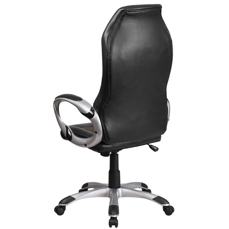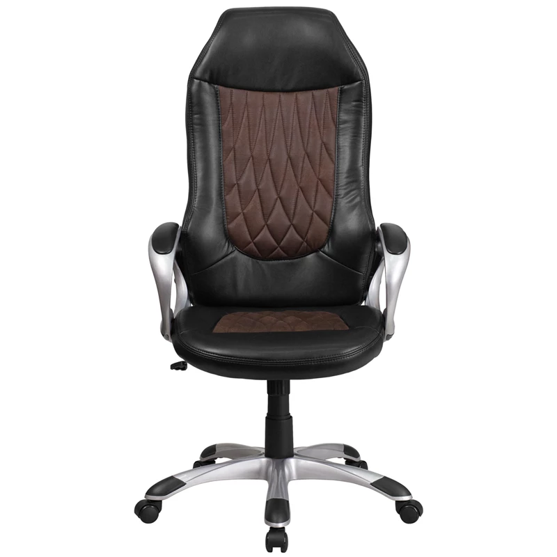 The contemporary computer chair will give you the comfort needed to get through the work day in style. The two-tone upholstery not only exudes style, but a professional appearance. Finding a comfortable chair is essential when sitting for long periods at a time. Having the support of an ergonomic office chair may help promote good posture and reduce future back problems or pain. High back office chairs have backs extending to the upper back for greater support. The high back design relieves tension in the lower back, preventing long term strain. The integrated headrest will take the pressure off of your neck while leaning back. The tilt lock mechanism offers a comfortable rocking/reclining motion. The free rein motion is great for taking a quick break from typing to answer phone calls and relax. The waterfall front seat edge removes pressure from the lower legs and improves circulation. Chair easily swivels 360 degrees to get the maximum use of your workspace without strain. The pneumatic adjustment lever will allow you to easily adjust the seat to your desired height. The silver nylon base with black caps prevents feet from slipping when resting on chairs base.