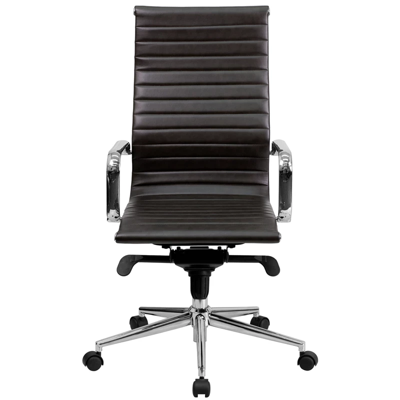 This elegant conference chair will give your home, office or conference room an upscale, minimalist look.It’s upholstered in leather and has polished aluminum arms and frame with an integrated coat hanger bar. The high back chair features a ribbed and foam molded, swivel seat and back, and built-in lumbar support. The seat and back are padded with CA117 fire retardant foam. A dual paddle control mechanism under the seat gives you the adjustment options you need for a custom fit. Turn the tilt tension adjustment knob to increase or decrease the amount of force needed to rock and recline. Lock the position in place with the locking knee-tilt control mechanism. Raise and lower your seat height using the pneumatic seat height adjustment lever, conveniently located under the seat. A polished aluminum base with dual wheel casters makes it easy to roll across the floor.The Black Leather Conference Chair is a great choice for your work or home office.