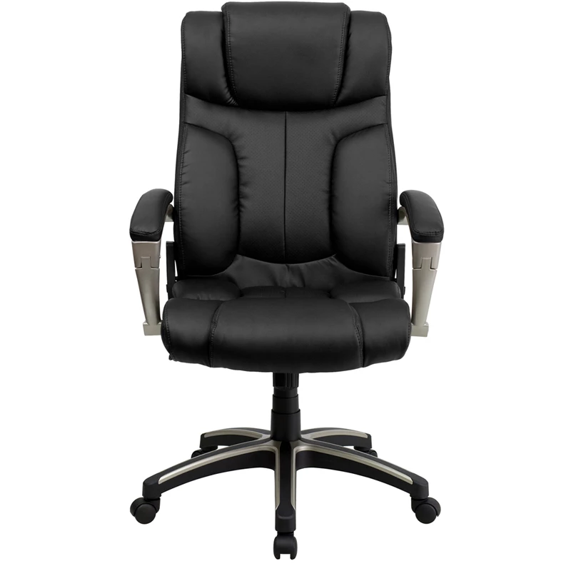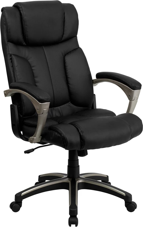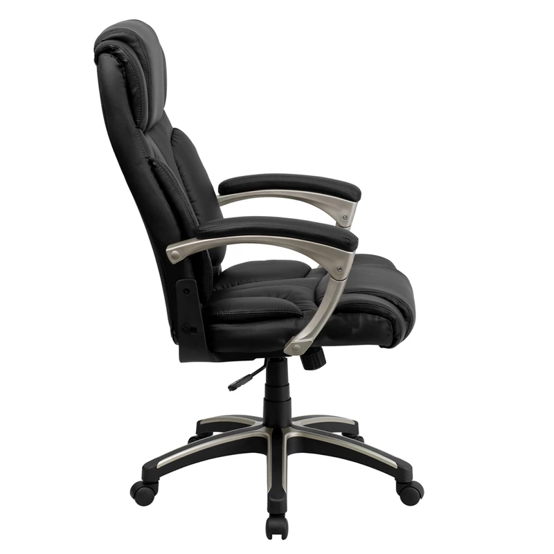 This unique designed office chair folds if you have the need to slide under your desk or give your office an open feeling when not in use. The two thumb sliders placed on the sides of the chair make it an easy transition to get to the folding position. Finding a comfortable chair is essential when sitting for long periods at a time. Having the support of an ergonomic office chair may help promote good posture and reduce future back problems or pain. High back office chairs have backs extending to the upper back for greater support. The high back design relieves tension in the lower back, preventing long term strain. The waterfall front seat edge removes pressure from the lower legs and improves circulation. Chair easily swivels 360 degrees to get the maximum use of your workspace without strain. The pneumatic adjustment lever will allow you to easily adjust the seat to your desired height. The heavy duty nylon base is trimmed in silver adding to the contemporary design.