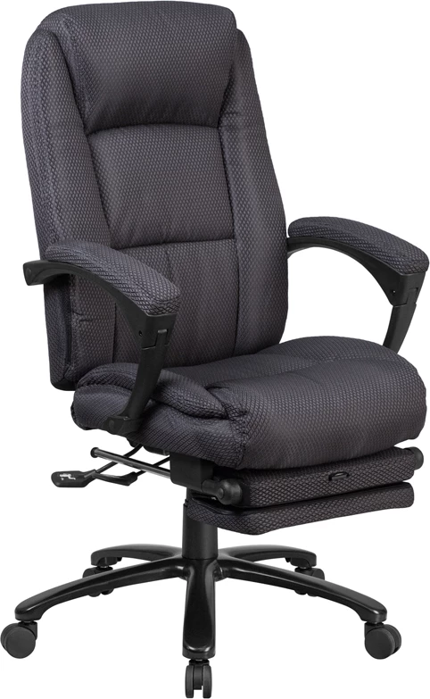 Go from sitting to a Reclined and Relaxed position with this Reclining High Back Executive Office Chair!Now you can have the best of both worlds with this dual designed office chair that offers you the comfort of a recliner in an office chair. High back office chairs have backs extending to the upper back for greater support. The reclining back lever allows you to lock your desired position for maximum comfort. The slide-out footrest keeps your feet elevated. The push button on the footrest raises the footrest if you prefer more elevation. Chair easily swivels 360 degrees to get the maximum use of your workspace without strain. The pneumatic adjustment lever will allow you to easily adjust the seat to your desired height.This ergonomically contoured chair will give you the support that you need to complete a day’s work.