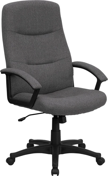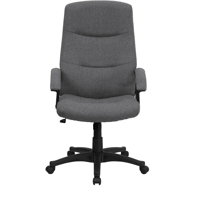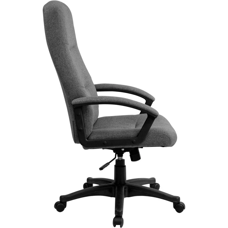 This fabric upholstered office chair features padded arms along with the horizontal line tufting. High back office chairs have backs extending to the upper back for greater support. The high back design relieves tension in the lower back, preventing long term strain. The waterfall front seat edge removes pressure from the lower legs and improves circulation. Chair easily swivels 360 degrees to get the maximum use of your workspace without strain. The pneumatic adjustment lever will allow you to easily adjust the seat to your desired height.