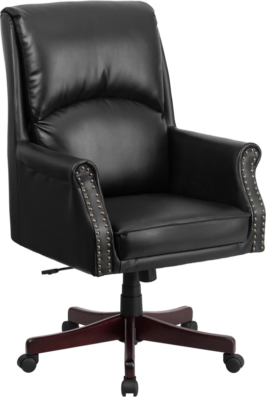 This luxurious traditional chair features soft Black Leather upholstery and brass nail accents that trim the rolled arms. Having the support of an ergonomic office chair may help promote good posture and reduce future back problems or pain. High back office chairs have backs extending to the upper back for greater support. The high back design relieves tension in the lower back, preventing long term strain. The plush pillow back cushion provides excellent support, allowing your back to rest comfortably. Chair easily swivels 360 degrees to get the maximum use of your workspace without strain. The pneumatic adjustment lever will allow you to easily adjust the seat to your desired height. The mahogany wood base adds to the charm of a traditional appearance.