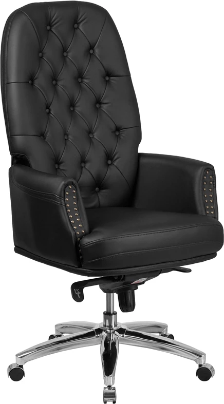 This button tufted executive office chair combines old world craftsmanship with modern seating principles, giving you a chair that feels as good as it looks. High back office chairs have backs extending to the upper back for greater support. The high back design relieves tension in the lower back, preventing long term strain. The locking tilt mechanism allows you to lock your chair in a comfortable work position. The free rein motion is great for taking a quick break from typing to answer phone calls and relax. Chair easily swivels 360 degrees to get the maximum use of your workspace without strain. The pneumatic adjustment lever will allow you to easily adjust the seat to your desired height. The arms are adorned with individual brass nail trim. The heavy duty chrome base adds a more modern flair.