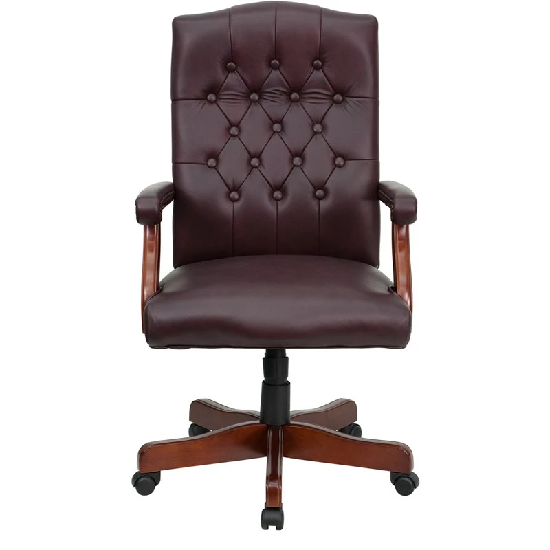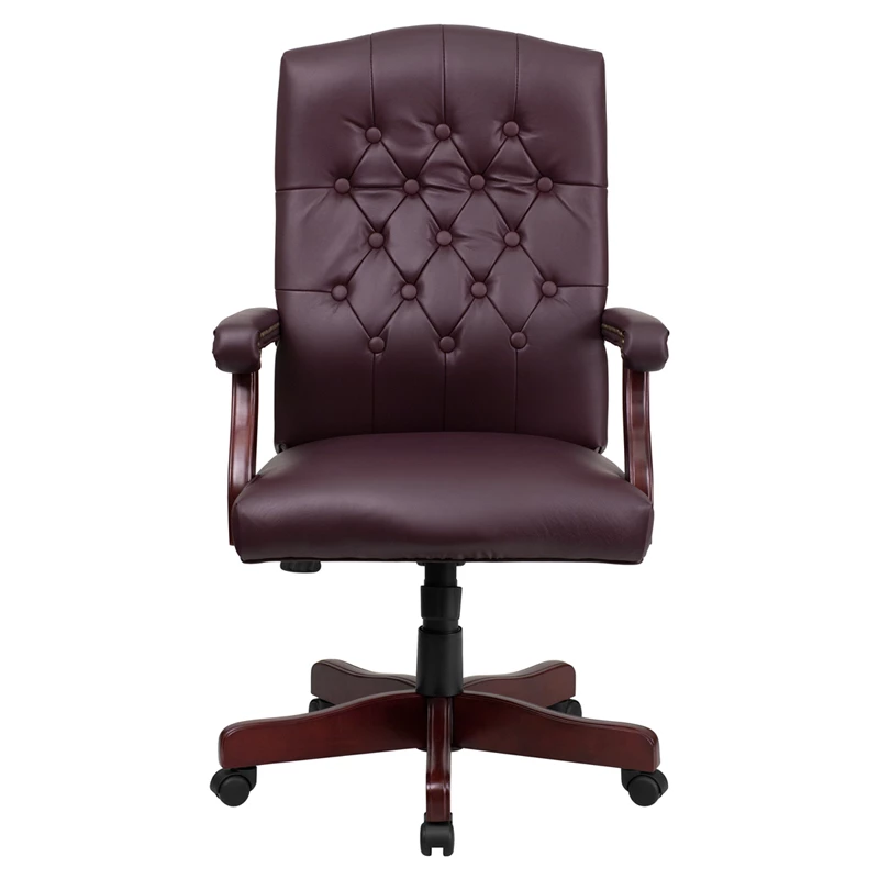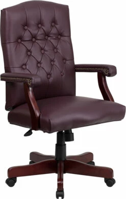 This luxurious traditional chair is available in a Burgundy Leather upholstery. Chair easily swivels 360 degrees to get the maximum use of your workspace without strain. The pneumatic adjustment lever will allow you to easily adjust the seat to your desired height. The arms are adorned in classic brass nail trimming. Ergonomically designed for a healthy way to work this chair will provide you with ample comfort, in the office or at home.