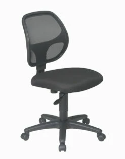 Mesh Screen Back Task Chair with Black Fabric Seat. Breathable Screen Back and Fabric Seat with Built-in Lumbar Support. One Touch Pneumatic Seat Height Adjustment. Heavy Duty Nylon Base with Dual Wheel Carpet Casters.