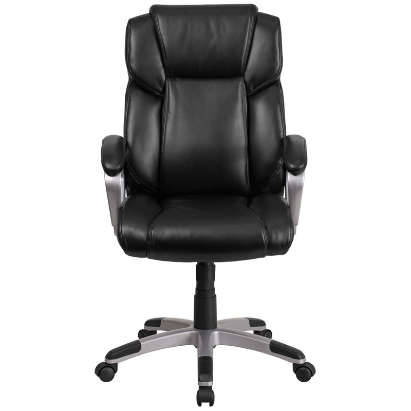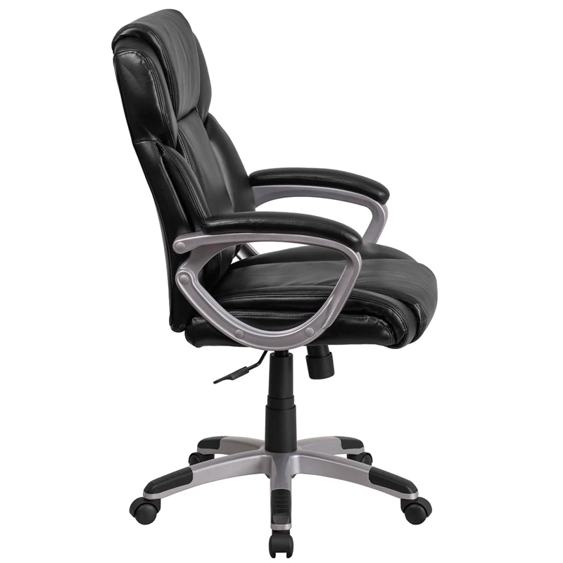This Executive Leather Office Chair offers a stylish appearance as well as comfort. The mid-back design provides support to the mid-to-upper back region. Turn the tilt tension adjustment knob to increase or decrease the amount of force needed to rock or recline. Lock the seat in place with the tilt lock mechanism. The waterfall front seat edge removes pressure from the lower legs and improves circulation. Chair easily swivels 360 degrees to get the maximum use of your workspace without strain. The pneumatic adjustment lever will allow you to easily adjust the seat to your desired height. The silver nylon base with black caps prevents feet from slipping when resting on chairs base. This chair will make for a great work or home office chair.
