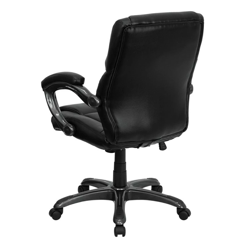 This attractively designed leather office chair provides a professional appearance to complement your office or home. This chair features an ergonomically contoured back and seat and arms that are comfortably padded. Mid-back office chairs are the logical choice for performing an array of tasks. A mid-back office chair offers support to the mid-to-upper back region. This chair is ideal for anyone who does a great deal of typing throughout the day and needs good back support. The waterfall front seat edge removes pressure from the lower legs and improves circulation. Chair easily swivels 360 degrees to get the maximum use of your workspace without strain. The pneumatic adjustment lever will allow you to easily adjust the seat to your desired height. The glossy smoke metal base with black caps prevents feet from slipping when resting on chairs base.