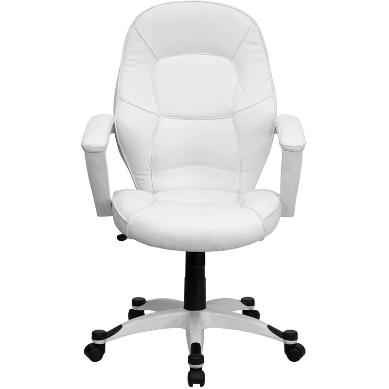 Set yourself apart from the masses with the typical black upholstered chair and make a statement with this appealing executive office chair, upholstered in soft white leather. High back office chairs have backs extending to the upper back for greater support. The high back design relieves tension in the lower back, preventing long term strain. The waterfall front seat edge removes pressure from the lower legs and improves circulation. Chair easily swivels 360 degrees to get the maximum use of your workspace without strain. The pneumatic adjustment lever will allow you to easily adjust the seat to your desired height. The white nylon base with black caps prevents feet from slipping when resting on chairs base.
