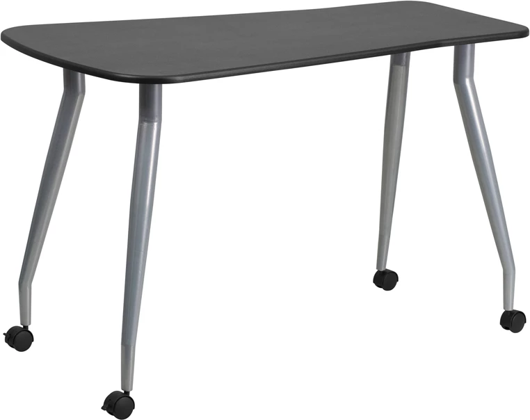 This contemporary desk offers a sleek design for managing daily household bills or for casual computer usage. This desk features a designer shaped desktop and casters for mobility.