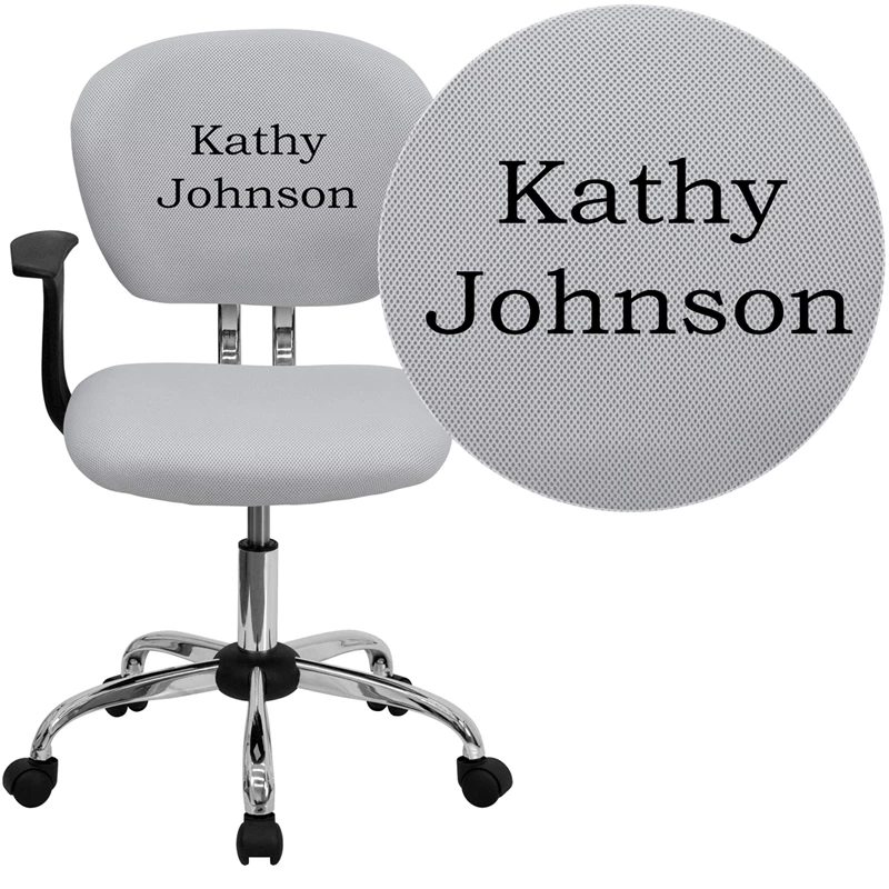 This mesh task chair supports you in comfort when you’re working long hours to get the job done. Personalize it with a name or other text embroidered on the chair’s back.It features a mid-back design to support your mid-to-upper back region. The swivel seat and back are padded with 2 inches of CA117 fire retardant foam and covered in mesh upholstery. Raise and lower the seat using the pneumatic seat height adjustment lever, conveniently located under the seat. A heavy-duty, chrome base with dual wheel casters makes it easy to roll across the floor.Whether you’re sitting in class, studying for a final exam or working to beat a tight deadline, this stylish chair will keep you cool and comfortable throughout your busy day.