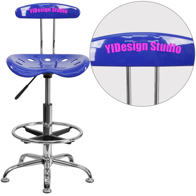 The Drafting Stool with Tractor Seat is a versatile option that’s sized right for the workbench in your garage, stand-up desk in your office and the island in your kitchen.The back and swivel seat are made from high-density polymer for durability and a sleek, shiny finish. Easily raise or lower the height of this drafting chair using the pneumatic adjustment lever, conveniently located under the seat. Plastic floor glides protect your floor by sliding smoothly when you need to move it and the heavy-duty, chrome base and foot ring complement the stool’s modern design. Personalize it with a name, nickname or company name on the chair’s back with durable UV resistant vinyl lettering.This contemporary drafting stool with comfort molded tractor seat combines leading edge style with great functionality.