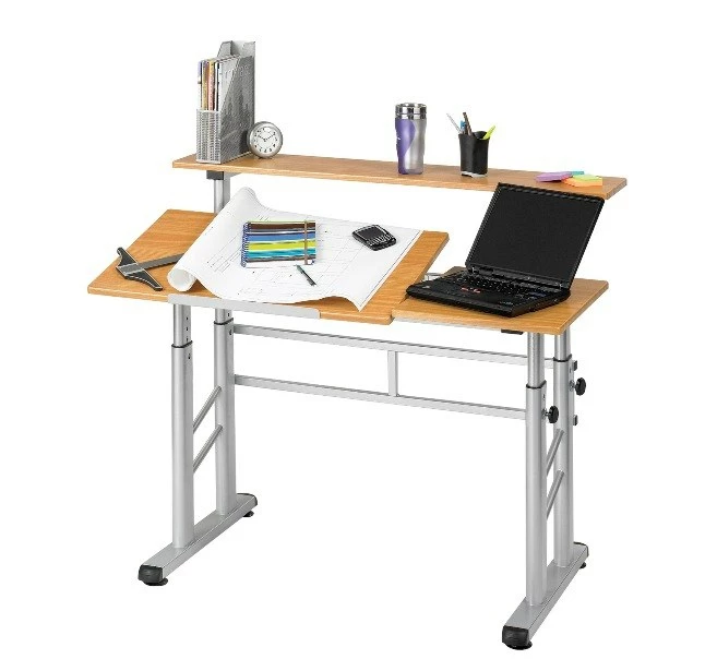 Get the results you desire with The Height Adjustable Split Level Drafting Table. The station functions as your personal drafting table, workspace, shelving area, computer desk and more. It’s great for home or office use for students, architects, engineers or artists. Tables can easily be lowered to serve as one flat working surface or raised to perform as a standing height workstation. With all this function you can easily go from drafting to everyday projects without hassle. Now that’s work flow.