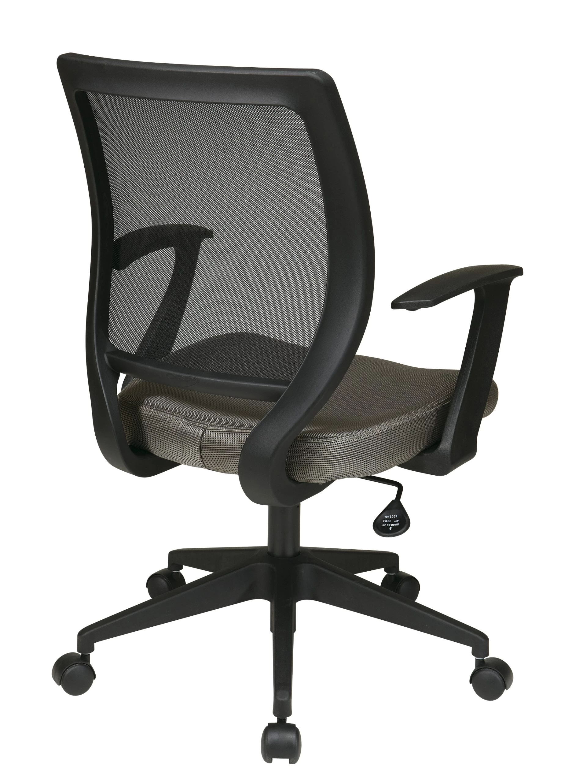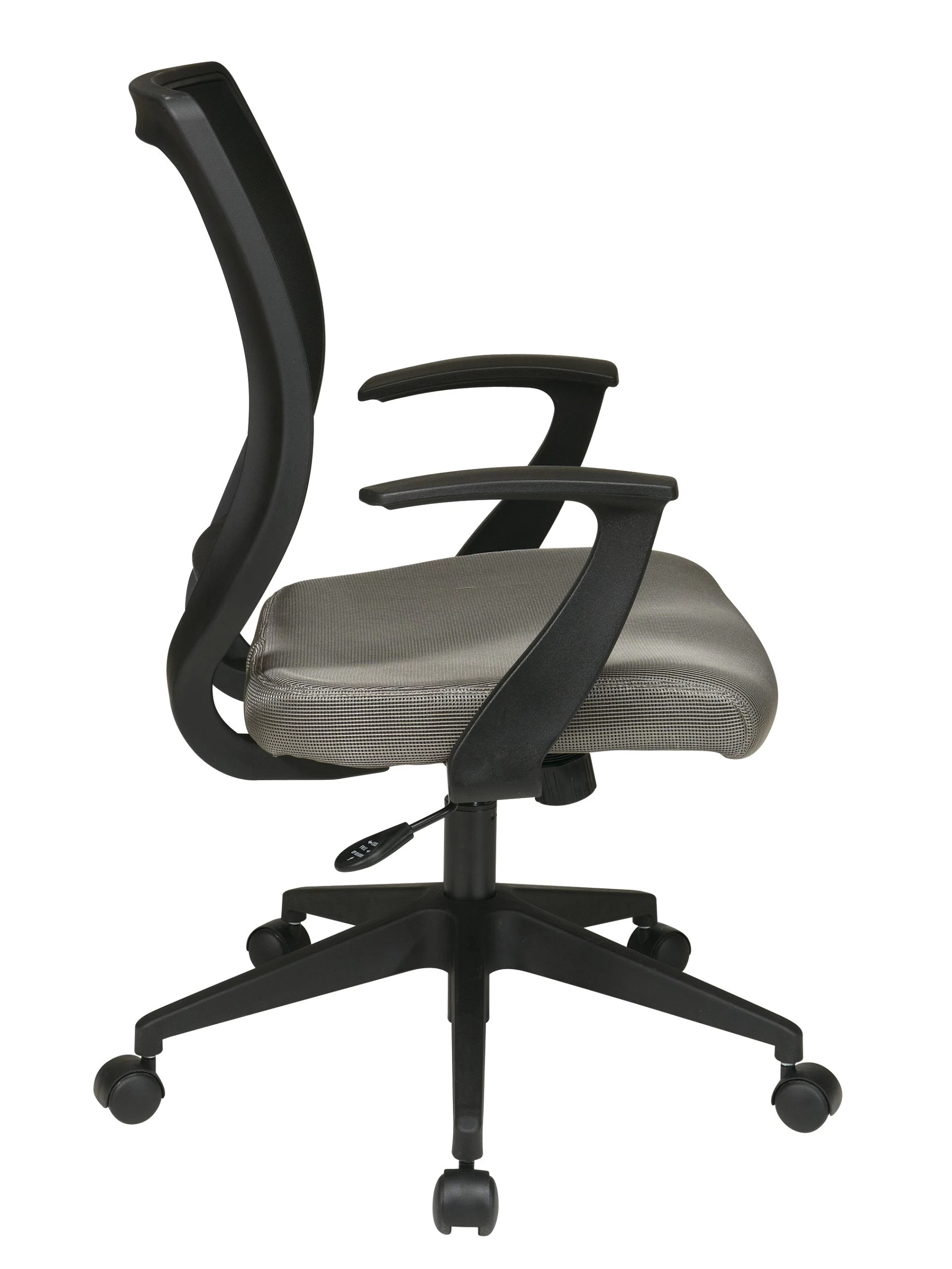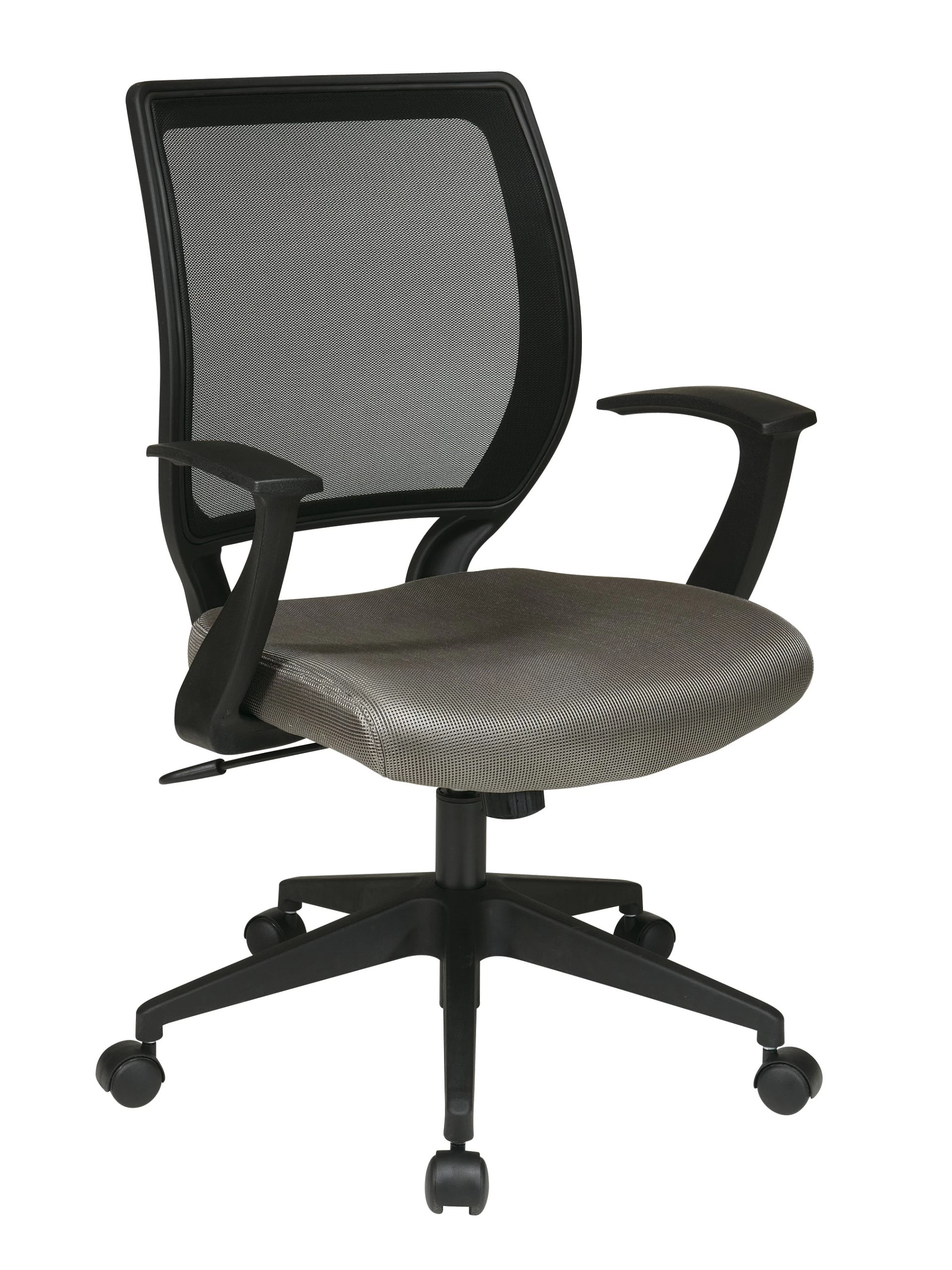 Work in comfort with the new work smart screen back and padded mesh and Seat task chair by Office Star. Outfitted with a one touch pressurized Pneumatic seat height adjustment and available in a variety of colors, this seating solution makes the perfect addition to any home. Intelligently engineered with a pressure responsive Screen back and padded mesh seat, this chair wicks away moisture while keeping your back comfortably cradled. Boasting a 360 degree swivel and padded T arms, this chair is perfect for home computer desk or checking emails at your office workstation. Couple all of these features with the heavy duty dual wheel carpet casters and you have a versatile task chair that is as affordable as it is comfortable.