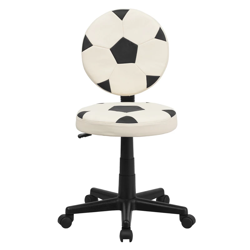 Bring your favorite sport to the desk with this Soccer Inspired Office Chair that is perfect for all young soccer fans! The round seat and back resembles two soccer balls that are upholstered in vinyl material for easy cleaning. This chair was designed to support the lower-to-mid back region. Chair easily swivels 360 degrees to get the maximum use of your workspace without strain. The pneumatic adjustment lever will allow you to easily adjust the seat to your desired height. With an affordable price tag it is sure to please the young soccer fan in your home.