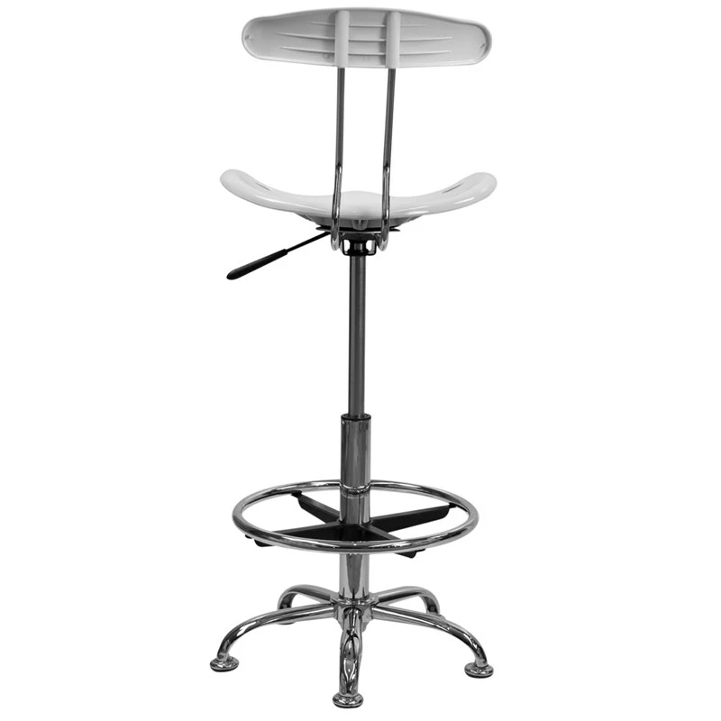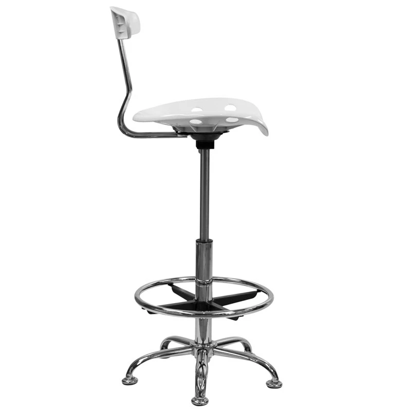 The Drafting Stool with Tractor Seat is a versatile option that’s sized right for the workbench in your garage, stand-up desk in your office and the island in your kitchen.The back and swivel seat are made from high-density polymer for durability and a sleek, shiny finish. Easily raise or lower the height of this drafting chair using the pneumatic adjustment lever, conveniently located under the seat. Plastic floor glides protect your floor by sliding smoothly when you need to move it and the heavy-duty, chrome base and foot ring complement the stool’s modern design.This contemporary drafting stool with comfort molded tractor seat combines leading edge style with great functionality.