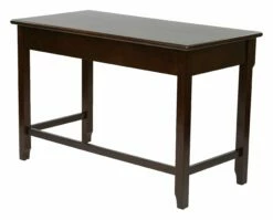This spacious computer desk has an architectural appeal with its leg design. This desk provides a great option for managing daily household bills, studying or for casual computer usage. This desk shows off a sleek appeal that will complement any contemporary work space.