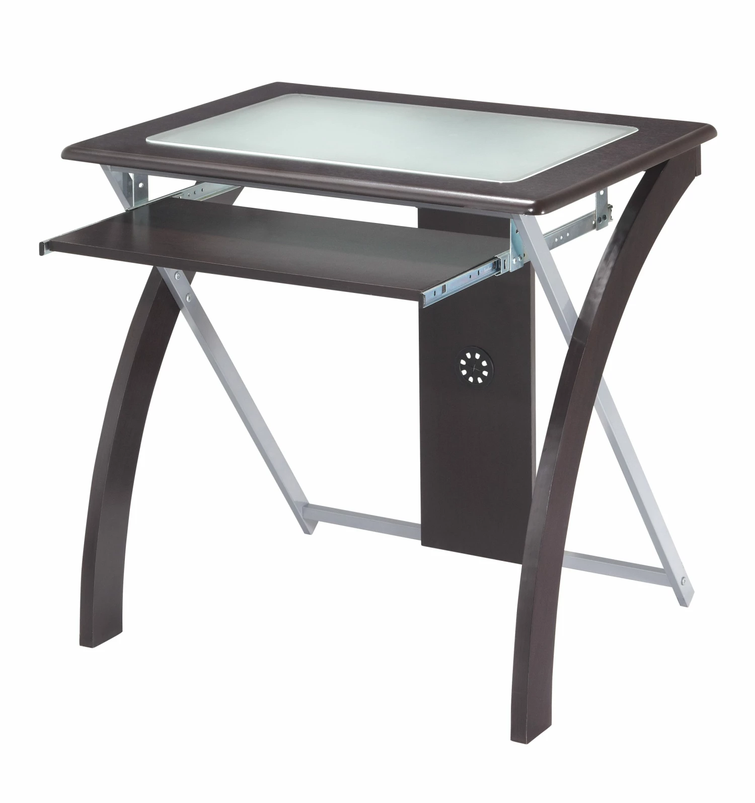 A trim and clever design, the X-Text Computer Desk mixes wood, glass and metal mediums to set a sleek modern tone. A frosted glass surface lends itself to a light and airy footprint making this workstation an easy addition for tight spaces and for those wanting an understated home office. The sliding tray adds additional work area when needed.
